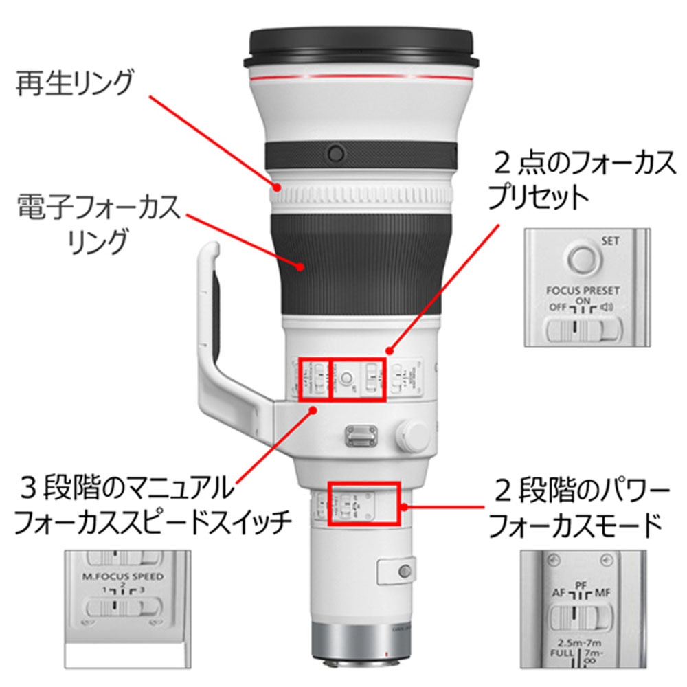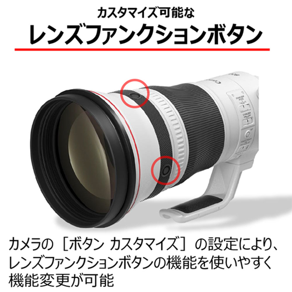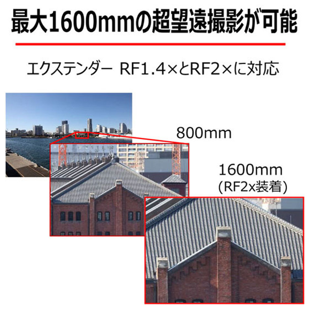 焦点距離をそれぞれ1.4倍、2倍に伸長する「エクステンダー RF1.4×」「エクステンダー RF2×」(別売)を装着することで、最長焦点距離1600mm相当の超望遠撮影が可能です。エクステンダー装着時もAFや手ブレ補正機能が使用できます。