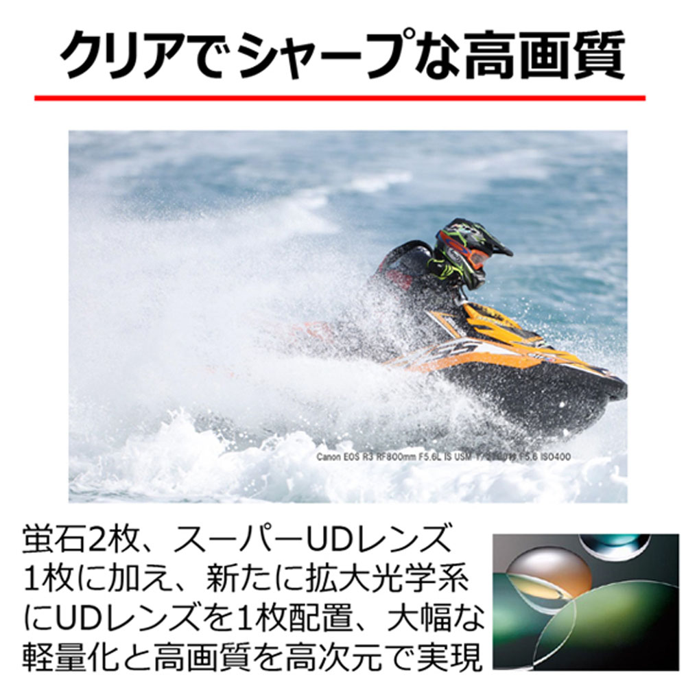 軽量化と高画質を高次元で実現している「RF400mm F2.8 L IS USM」の光学系を受け継ぎ、レンズ後部に最適な拡大光学系を配置して長焦点距離化しました。小型軽量化し、実用性を増した超望遠レンズの登場により、天体や野生動物、航空機、スポーツといった撮影シーンにおいてユーザーの撮影領域を拡大します。蛍石とスーパーUDレンズなどの活用により色にじみのないクリアでシャープな高画質を実現しています。