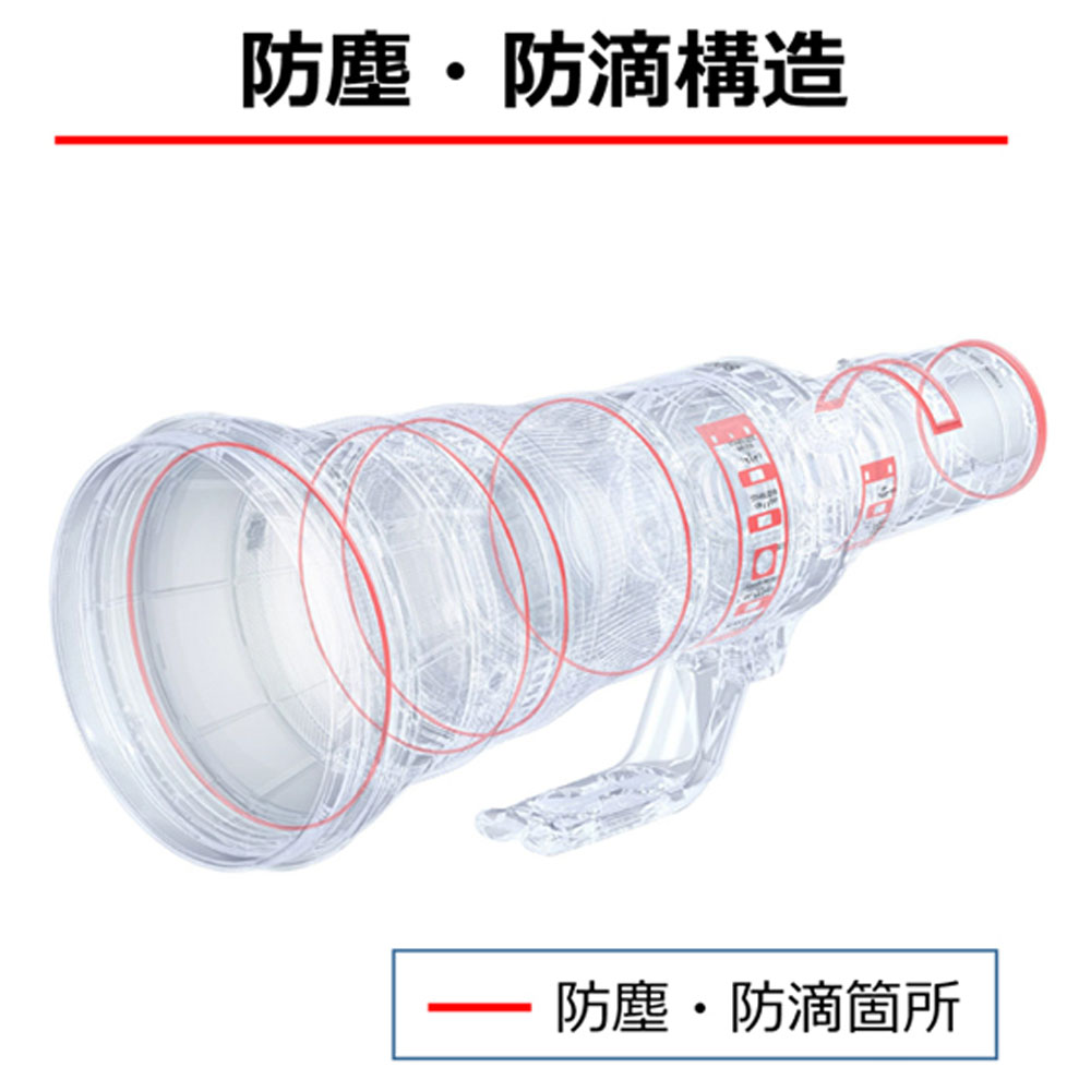 太陽光に含まれる赤外線の反射率を高めた遮熱塗料を採用し、炎天下における屋外スポーツなどの長時間撮影でも、レンズの温度上昇を抑制します。また、マウント部、スイッチ部、フォーカスリングなどに防じん・防滴構造を採用(※)し、最高水準の性能を追求した「L(Luxury)」レンズにふさわしい信頼性を確保しています。