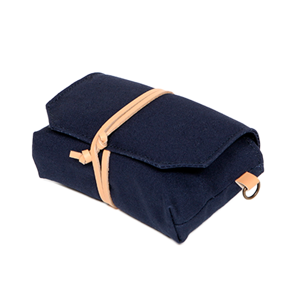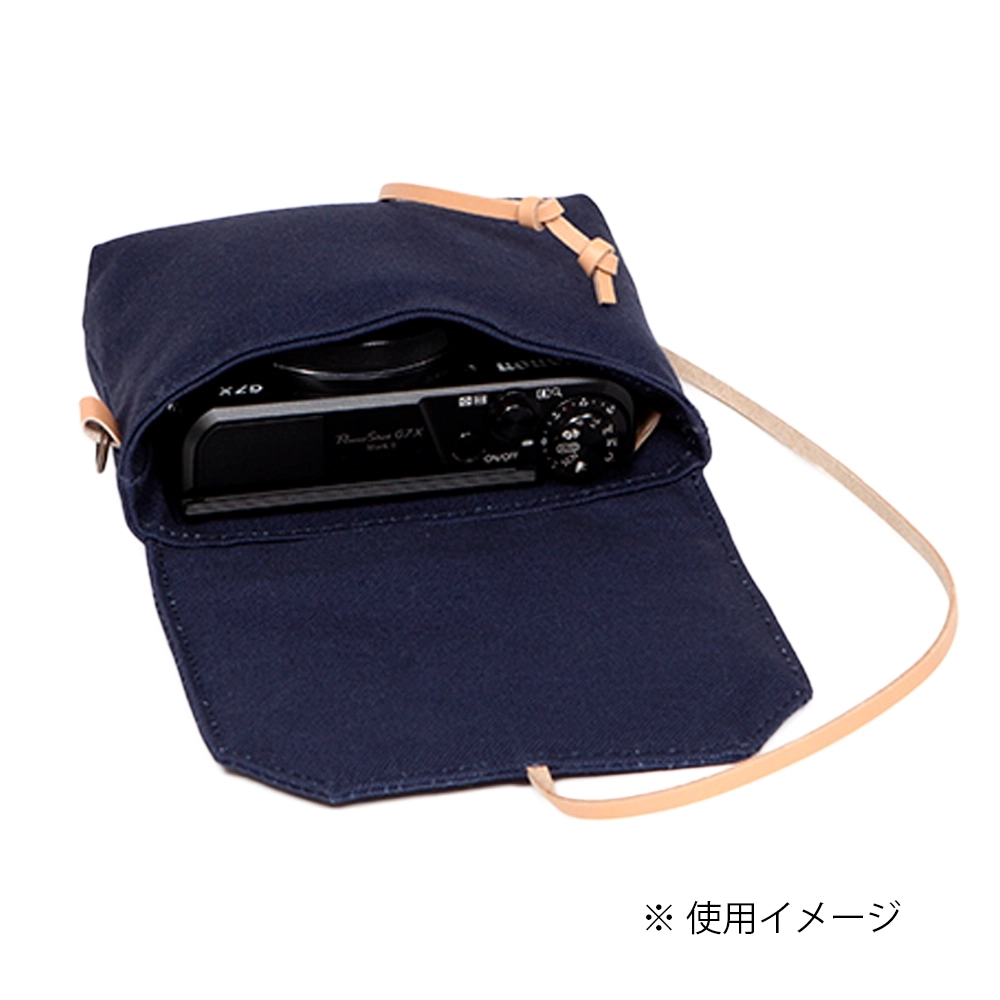 丈夫な11号帆布を使用したコンパクトカメラ用ポーチです。革紐を巻き付けてフタを固定するだけのシンプルな構造なので、いろいろなサイズの機種に対応