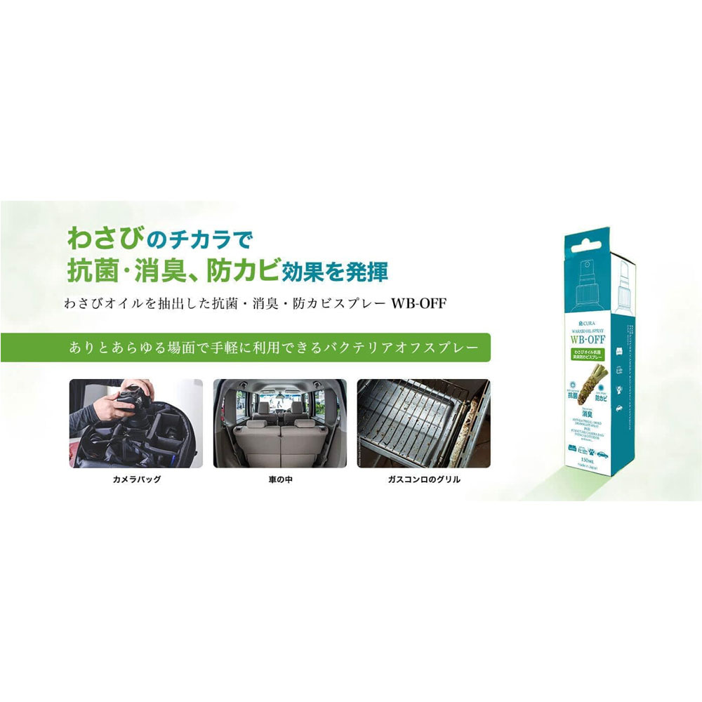 天然のわさびオイルを抽出する技術により、わさびの抗菌・消臭、防カビの効果を手軽に様々なシーンで利用できる、全く新しいバクテリアオフスプレーです。