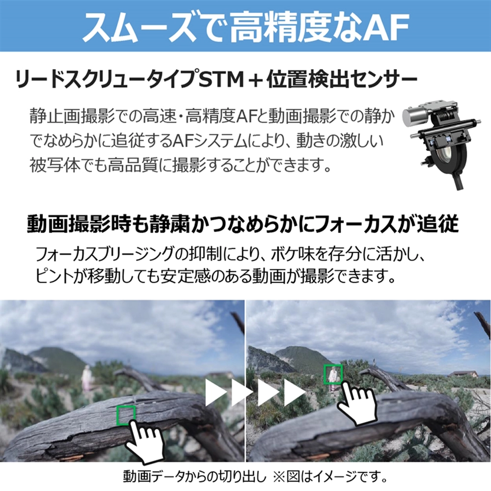 リアフォーカス+STM駆動に加え、マイクロプロセッサーによるアクチュエータ制御とカメラ側のAFアルゴリズムとのマッチングを図ることで、高速で高精度なAFを実現。静止画撮影での高速・高精度AFと動画撮影での静かでなめらかに追従するAFシステムにより、動きの激しい被写体でも高品質に撮影することができます。