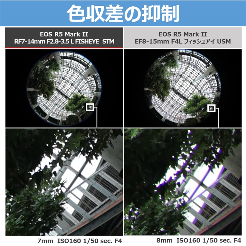 EF8-15mm F4L フィッシュアイ USMが全域F4に対して、RF7-14mm F2.8-3.5 L FISHEYE STMは、開放F値2.8-3.5を実現して明るいレンズに仕上げています。広角側ではより速いシャッター速度が使えるため暗所撮影に有利です。