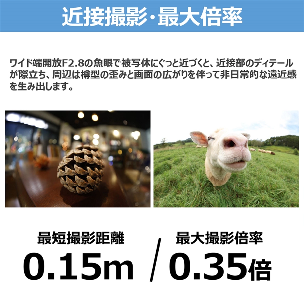 最短撮影距離 0.15m(7-14mm AF時)、最大撮影倍率 0.35倍(14mm AF時)まで被写体に大きく近づいて撮影が可能。 フィッシュアイレンズ特有の最大190°の広い画角と遠近感を活かし、表現力豊かな個性あふれるクローズアップ撮影が楽しめます。