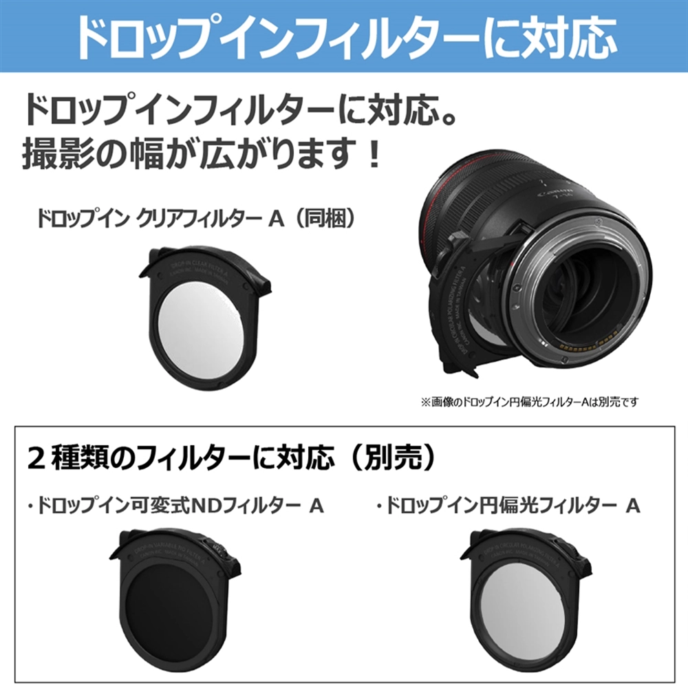 バックフォーカスを確保することでドロップインフィルターに対応。特に、ドロップイン可変式NDフィルターAを使い濃度を調整することで、明るさが連続して変化する環境下や、スローシャッターで水面を滑らかに表現したい動画撮影に便利です。また、ドロップイン円偏光フィルターAは特に風景写真で効果を発揮し、青空をより深く再現したり、葉の色を鮮やかに表現することが可能です。