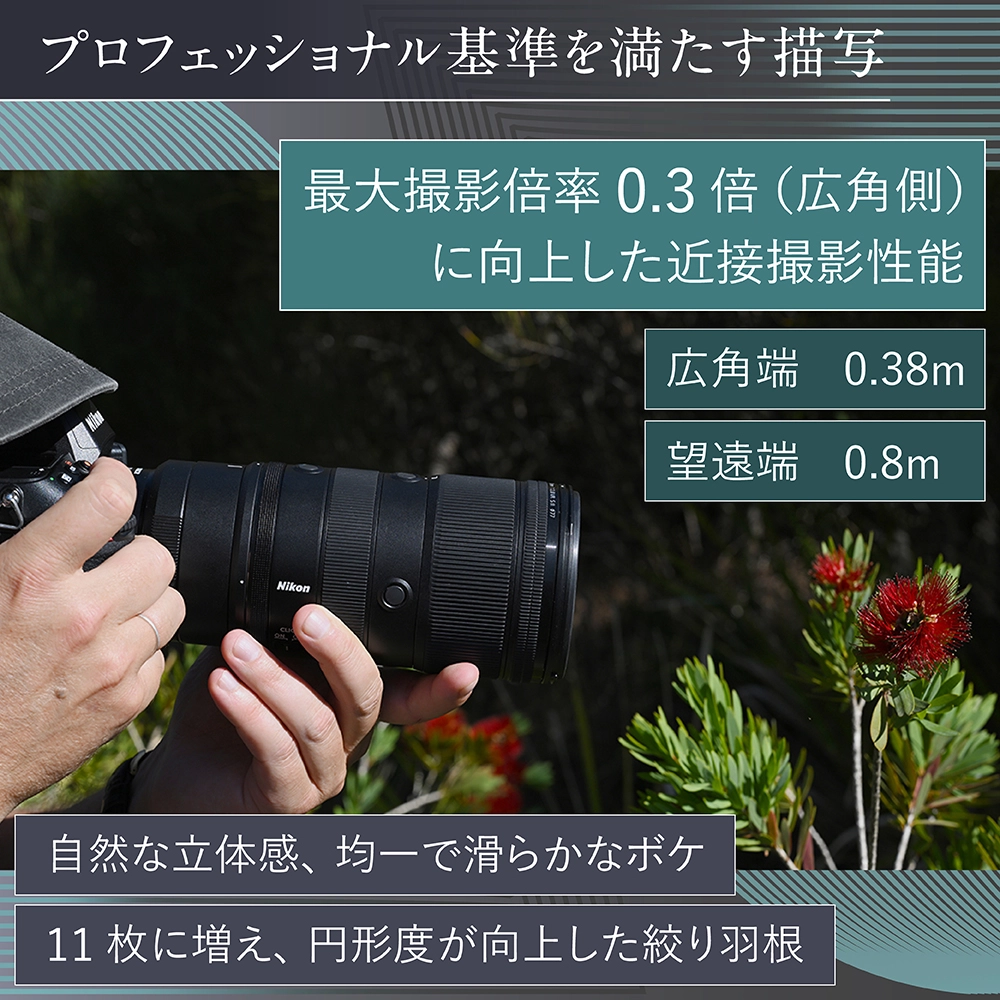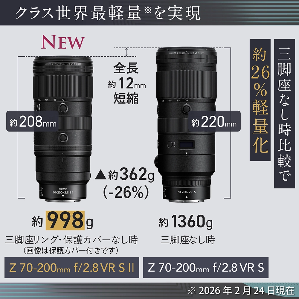 ※1:2026年2月24日現在、発表済みの70-200mm f/2.8のフルサイズ/FXフォーマットミラーレスカメラ用交換レンズにおいて。ニコン調べ。