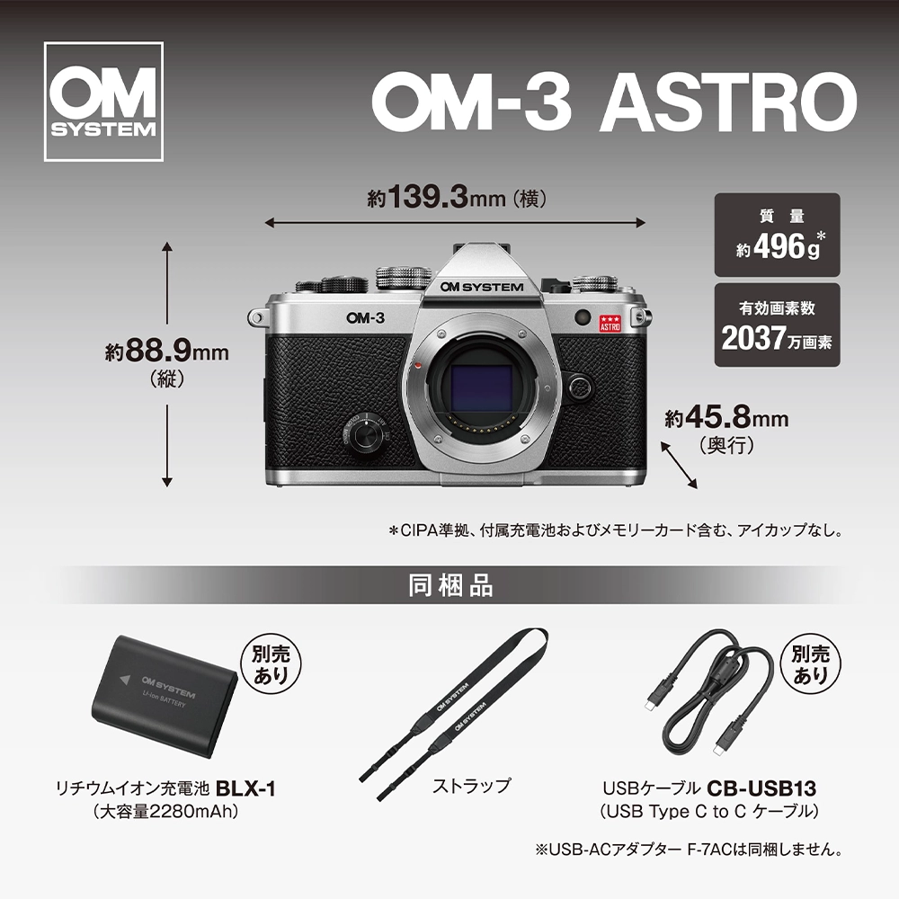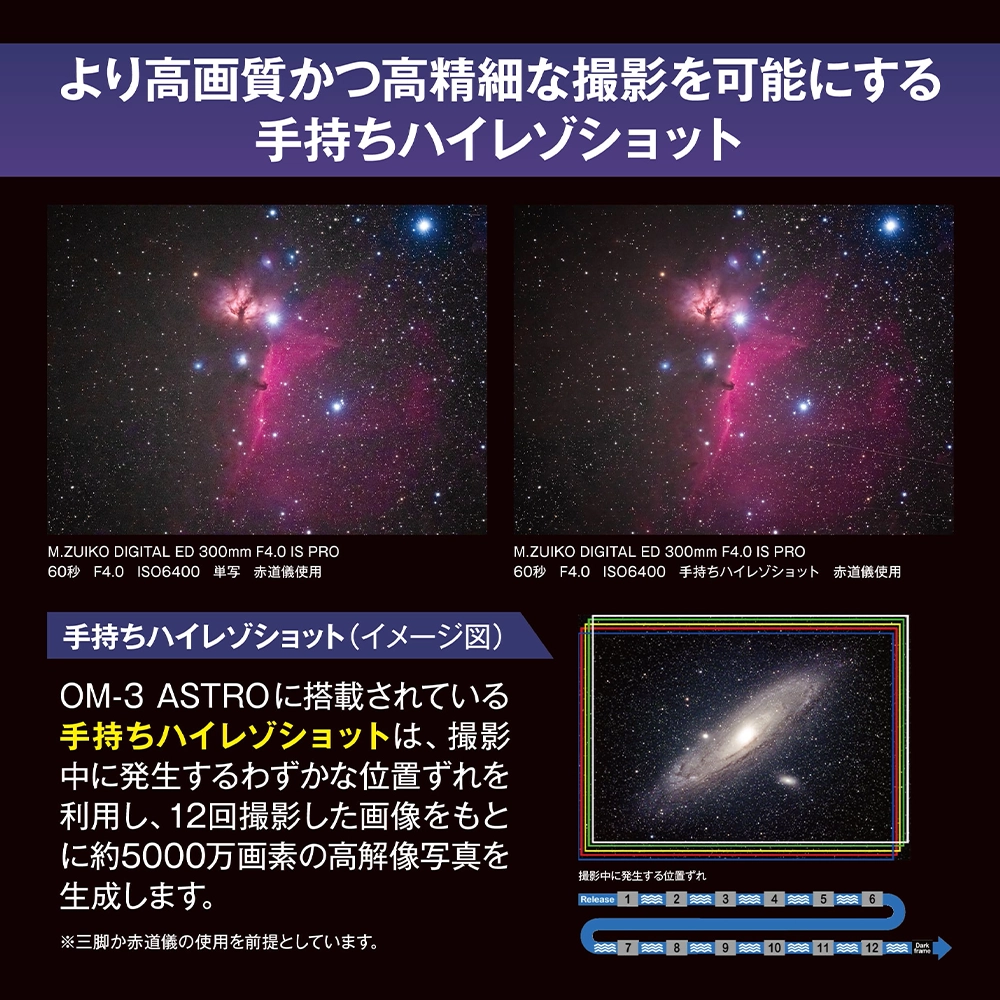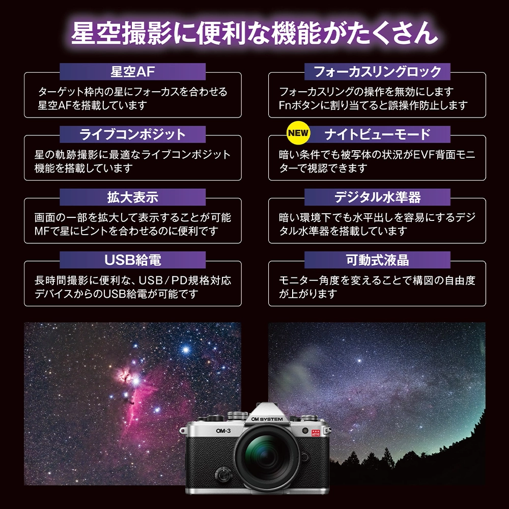 「OM-3 ASTRO」は、「OM-3」と同様に、星空撮影に便利な様々な機能を搭載しています。