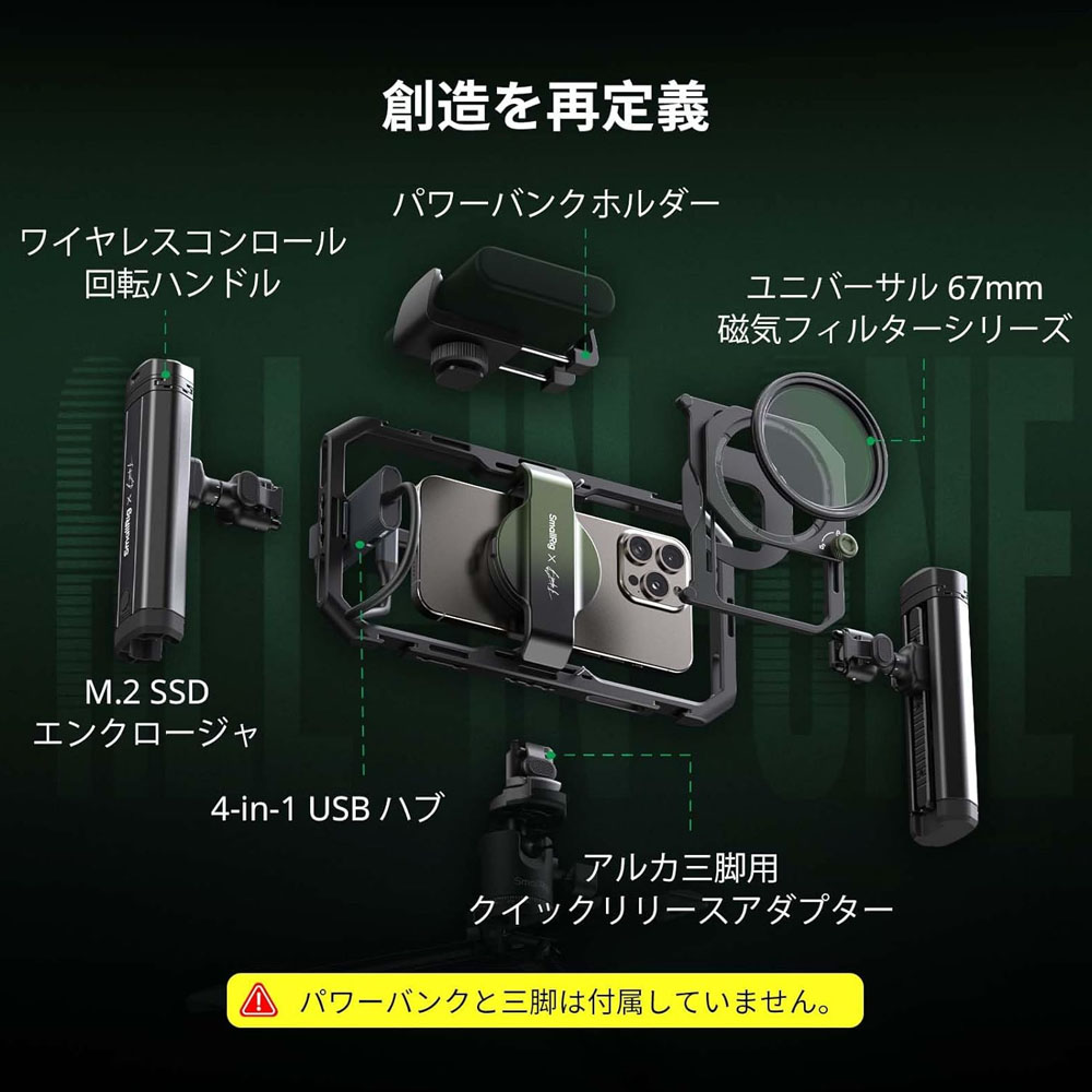 キットには、スマホケージ、M.2 SSDエンクロージャとワイヤレスリモートコントローラーを備えた回転式サイドハンドル、67mmユニバーサルフィルターアダプター、磁気67mm VND 2-32(1-5ストップ)、4-in-1 USB-Cドッキングステーション、アルカスイス用クイックリリースアダプター、パワーバンクホルダー、その他のアクセサリが含まれています。