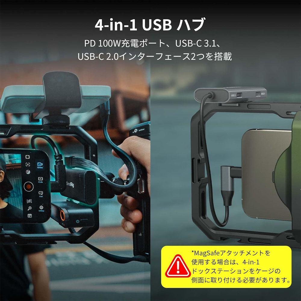 スマホケージは、MagSafeまたはスマホクリップを介してスマホを固定できます。ケースをつけたまま使用可能です。