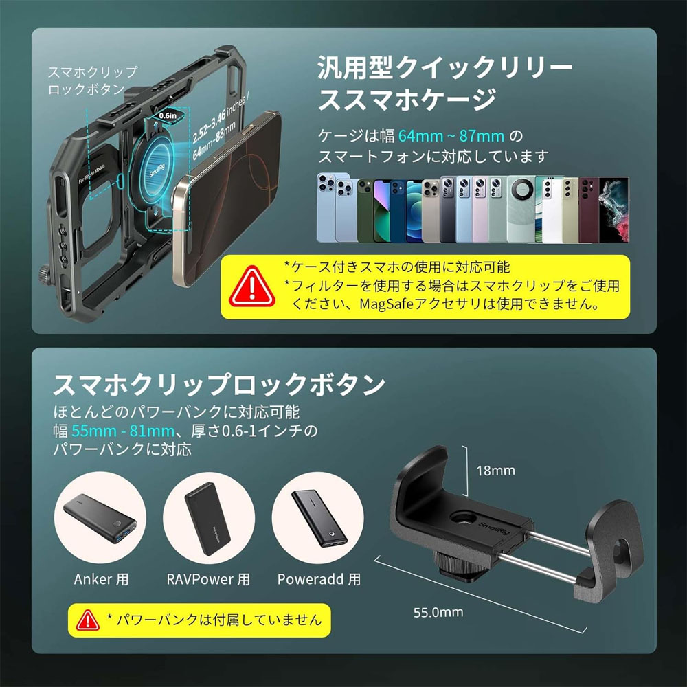スマホケージは、MagSafeまたはスマホクリップを介してスマホを固定できます。ケースをつけたまま使用可能です。