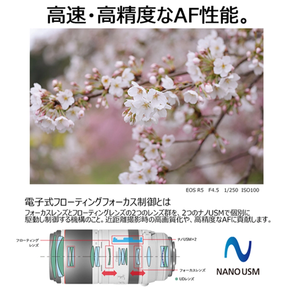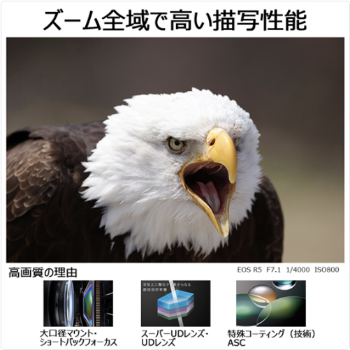 機動性の高い超望遠ズームレンズ。1本で幅広いシーンをカバーできるズームレンズです。また、高い解像性能と携帯性も実現しています。Lレンズとしての信頼性と高画質を継承しながら、EOS Rシステムがもつ最新技術と、機動性を生かした超望遠ズームレンズです。