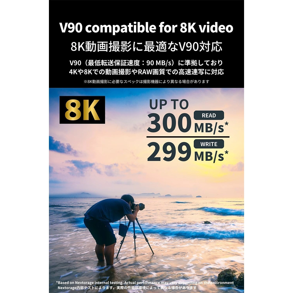 SDカードの利便性と高水準の書き込み / 読み出しスピードの両方を求めるビデオグラファーやフォトグラファーのためのNX-F2PROシリーズ。8K動画撮影※や高速連写に優れた性能を発揮し、UHS-II対応機の撮影性能を最大限引き出します。