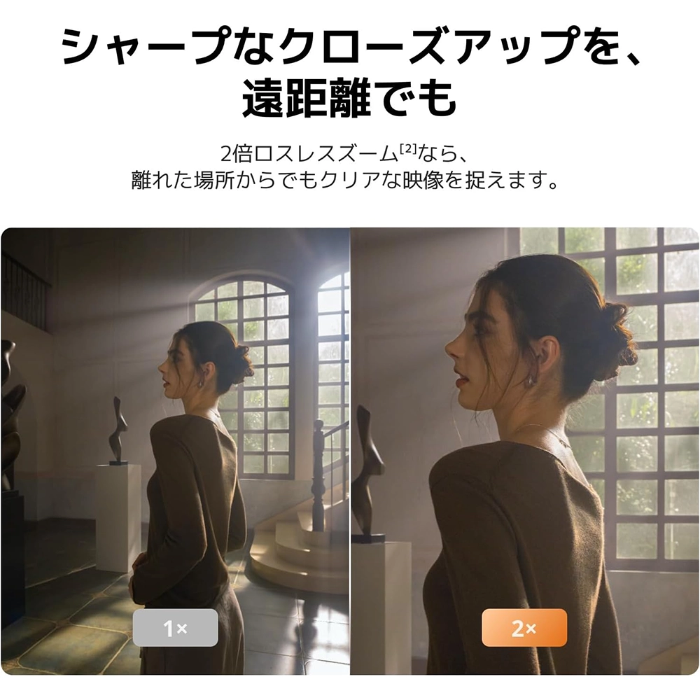2倍ロスレスズーム[4]で遠くからでもクリアな映像を撮影。ワンタップで1倍と2倍のビューを簡単に切り替えられます。