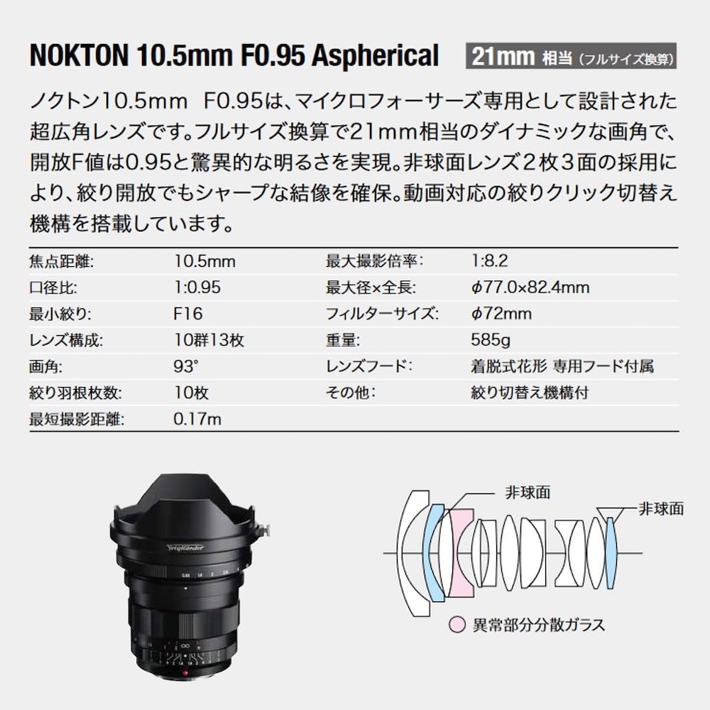 ノクトン10.5mm F0.95は、マイクロフォーサーズ専用として設計された超広角レンズです。対角線93°(35mm判換算で21mmレンズ相当)のダイナミックな画角で、開放F値は0.95と驚異的な明るさを実現。非球面レンズ2枚3面の採用により、絞り開放でもシャープな結像を確保。動画対応の絞りクリック切替え機構も搭載しています。