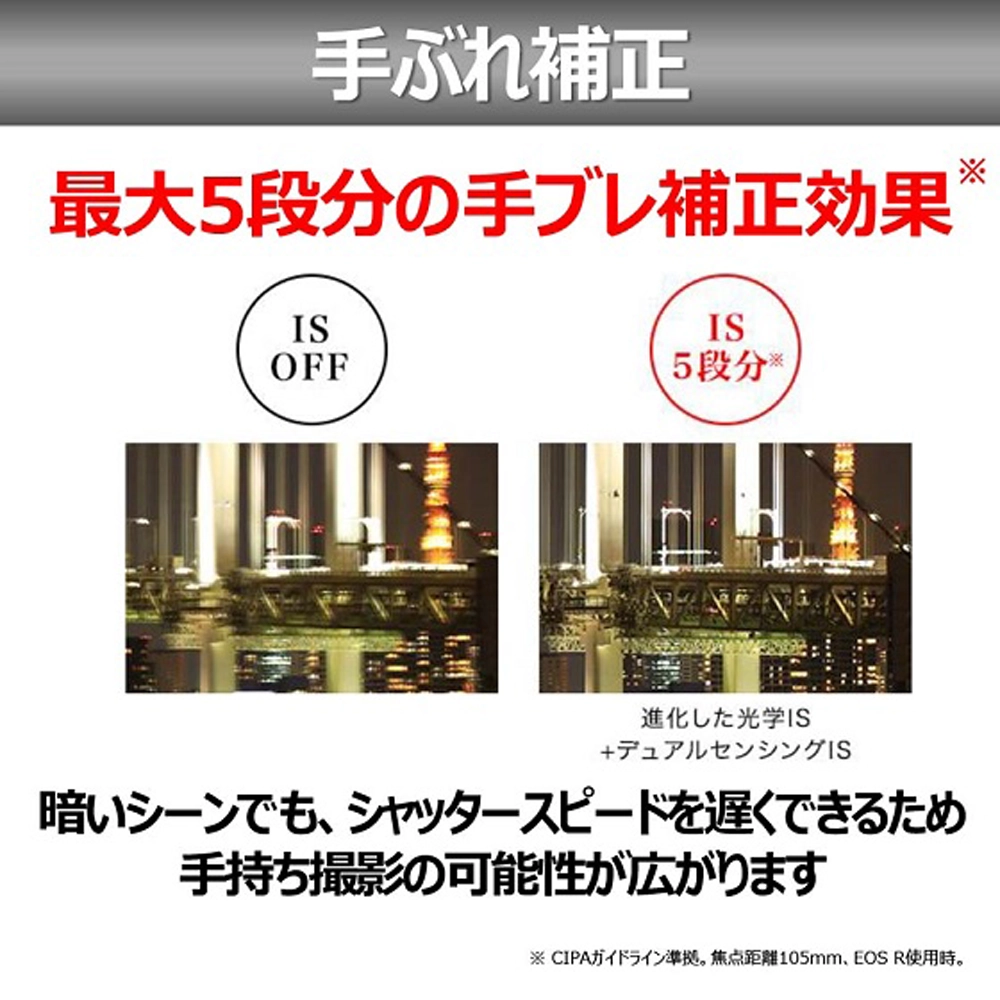 全長107.3mm、質量約700gの小型・軽量設計を実現しています。 静止画撮影時における高速AFと、動画撮影時の滑らかなAFを可能にするナノUSMをLレンズで初めて採用。 また、5段分の光学式手ブレ補正機構を搭載し、手持ち撮影を強力にサポート。 絞りやシャッタースピード、ISO感度などの機能が割り当てられるコントロールリングにより、新しい操作性を実現します。