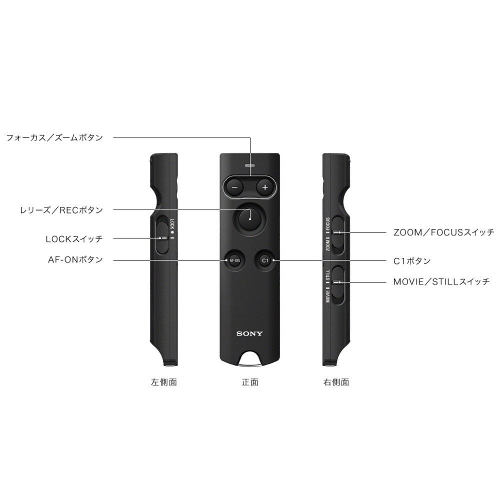 カメラのフォーカスやズームをRMT-P1BTから操作できます。「フォーカス/ズームボタン」を使ってそれぞれの操作を行うことができ、マニュアルフォーカス時のわずかなフォーカス調整も可能です。フォーカス機能とズーム機能の切り替えは「ZOOM/FOCUSスイッチ」で行えます。また、カメラ本体のC1ボタンに割り当てられた機能を呼び出せる「カスタムボタン」も装備しています。