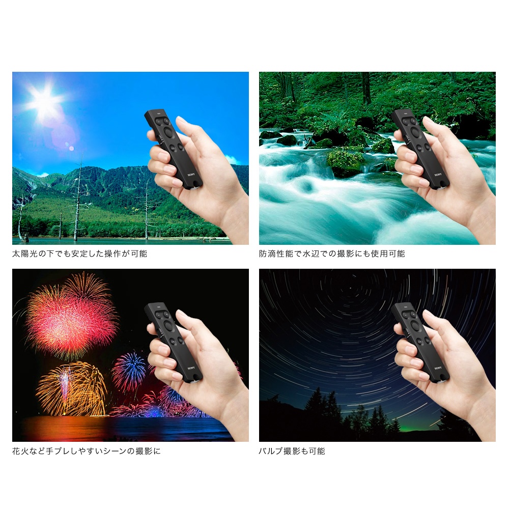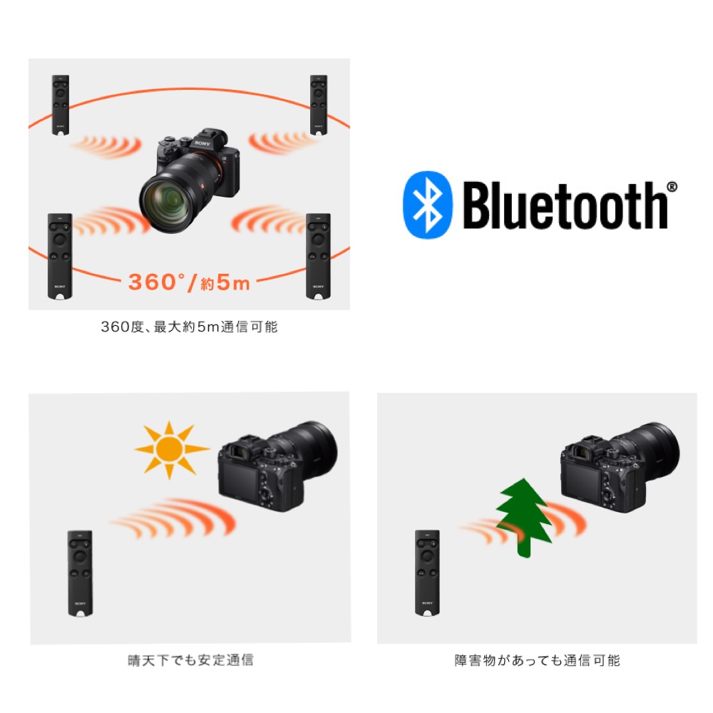 無線方式にBluetoothを採用。赤外線通信方式に比べ、太陽光の下でも安定した操作を実現します。また、カメラと撮影者の間に障害物がある場合でもリモート操作が可能。通信可能距離約5m、360度全方向から通信できます。