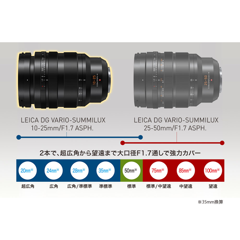 ズーム全域で優れた描写性能を実現した「SUMMILUX(ズミルックス)」大口径標準ズームレンズです。開放値F1.7により、低照度下でも大口径単焦点レンズ交換を必要とせず本レンズ1本だけで対応ができ、静止画のみならず動画双方で背景を活かした印象的な表現が可能となり、撮影の幅が広がります。