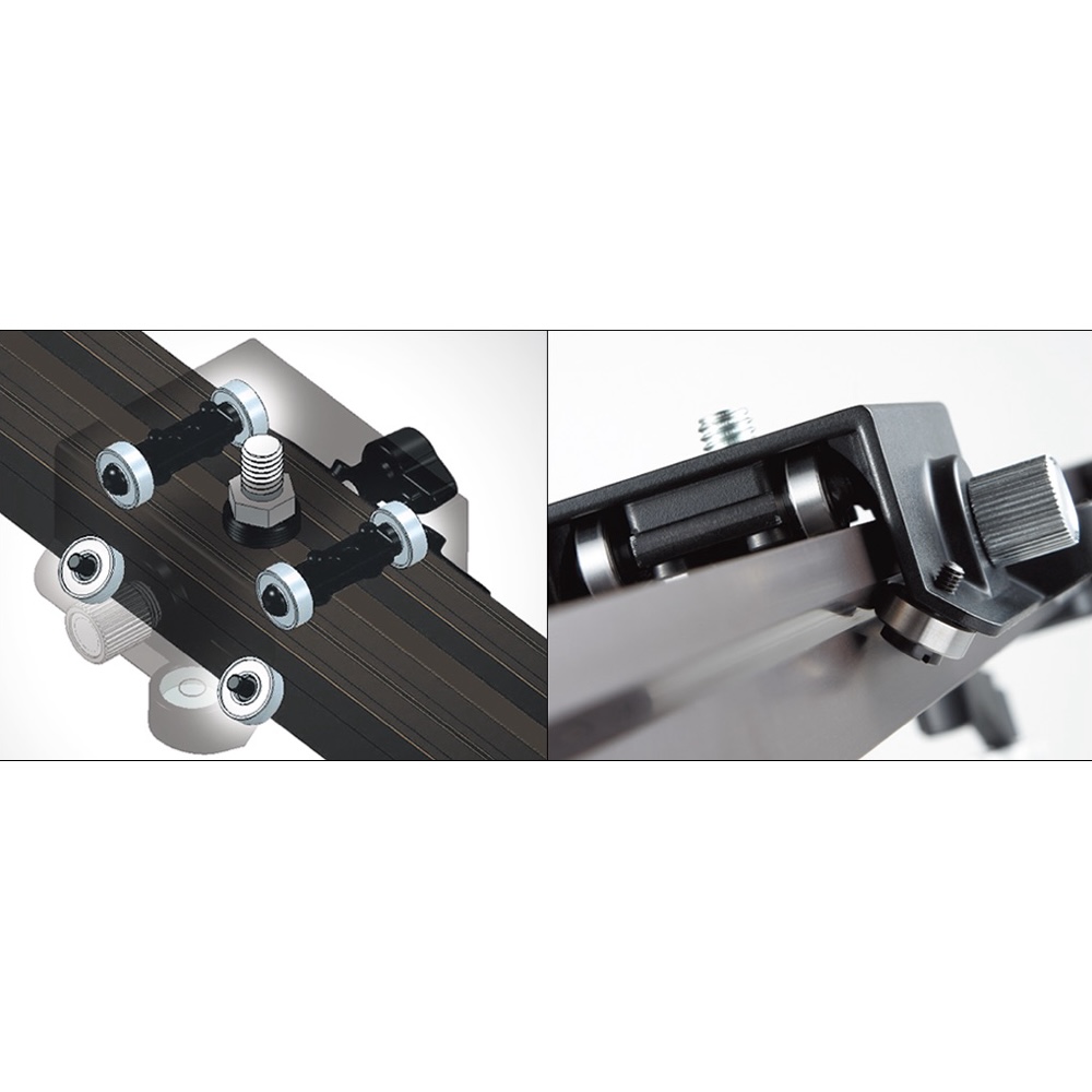 高精度ボールベアリングが計8個装着されています。さらにボールベアリングの内部に特殊グリースを充填。滑らかで粘りのあるコントロール性能に優れたスライダーショットを実現します。また、レール上面と背面斜めの角度からベアリングで挟みこむ構造により、使用後もガタつきを発生させません。