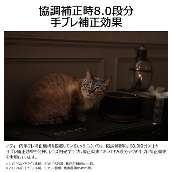 ボディー内手ブレ補正機構を搭載しているカメラにおいては、協調制御により8.0段分の手ブレ補正効果を発揮。レンズ内光学手ブレ補正効果においても5段分の手ブレ補正効果を実現しています。
