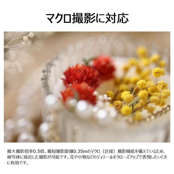 最大撮影倍率0.5倍、最短撮影距離0.35mのマクロ(近接)撮影機能を備えているため、被写体に接近した撮影が可能です。花や小物などのディテールをクローズアップで表現したいときに有効です。