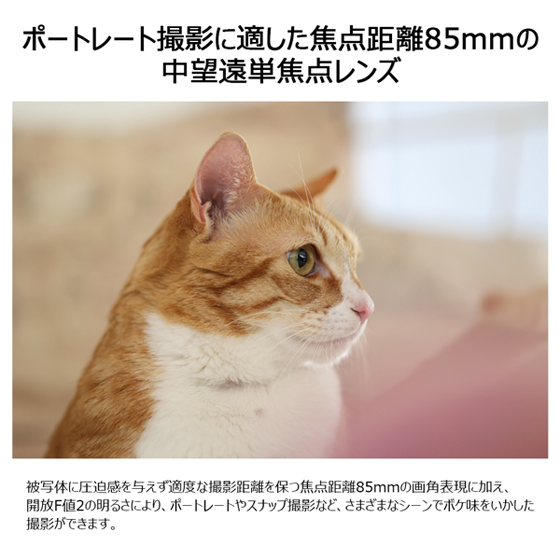 被写体に圧迫感を与えず適度な撮影距離を保つ焦点距離85mmの画角表現に加え、開放F値2の明るさにより、ポートレートやスナップ撮影など、さまざまなシーンでボケ味をいかした撮影ができます。