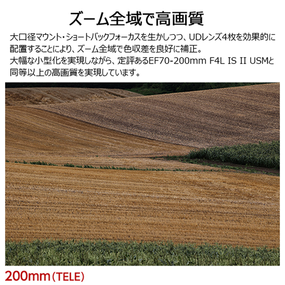EOS Rシステムの特長である大口径マウントとショートバックフォーカスを活かした、独自の光学系を採用。従来機種に比べ大幅な小型・軽量化を達成しつつ、ズーム全域で画面中心から周辺までLレンズにふさわしい高画質、快適な操作性を実現しました。