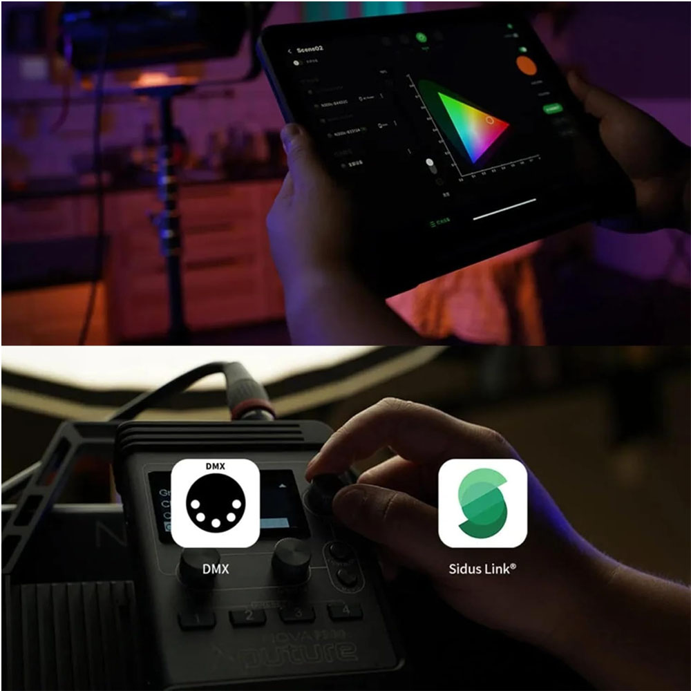コントロールボックスにBluetoothアンテナを搭載し、「Sidus Link」アプリから色温度や色を設定可能。 HSIやRGB値を数字から指定、またスマホカメラで撮影したものの色を反映させるピッカー機能にも対応します。 Sidus Mesh機能により、離れた複数台を同時に接続してコントロールすることもできます。