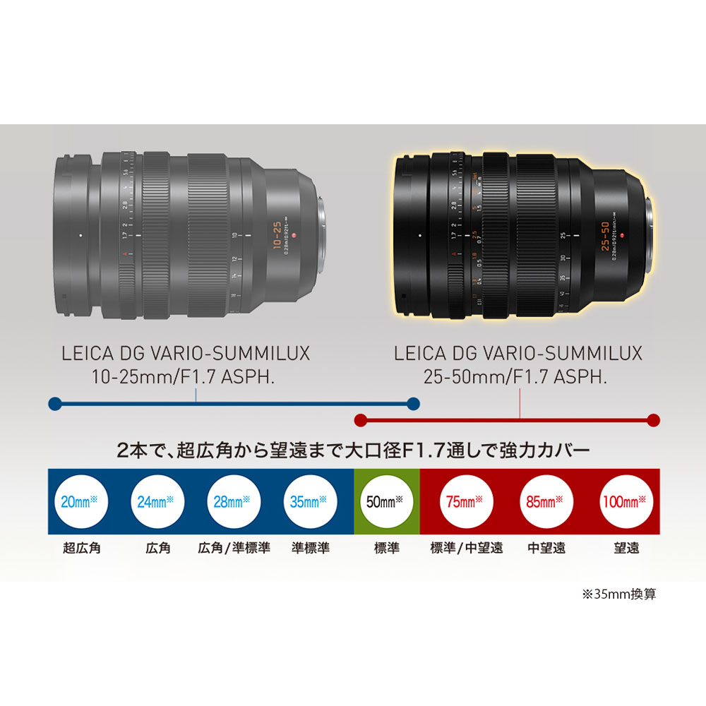 また、【H-X1025】と組み合わせることで、20mm(※)の超広角から100mm(※)の望遠までの焦点距離をレンズ2本でカバーできます。単焦点レンズ8本分の焦点距離をカバーするのでレンズ交換の手間が省け、さらにこの2本は同等のサイズ・重心バランスなので、ジンバル使用でのレンズ交換時のバランス調整時間を短縮し、スムーズなオペレーションが可能でスピードを求められる撮影などで活躍します。また、F1.7ズームレンズシリーズは、共通の設計思想により、描写性能を揃え、一貫した高いクオリティの表現を実現し、ポストプロダクションの効率化を図ります。