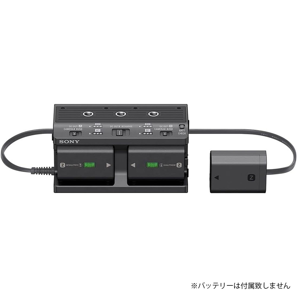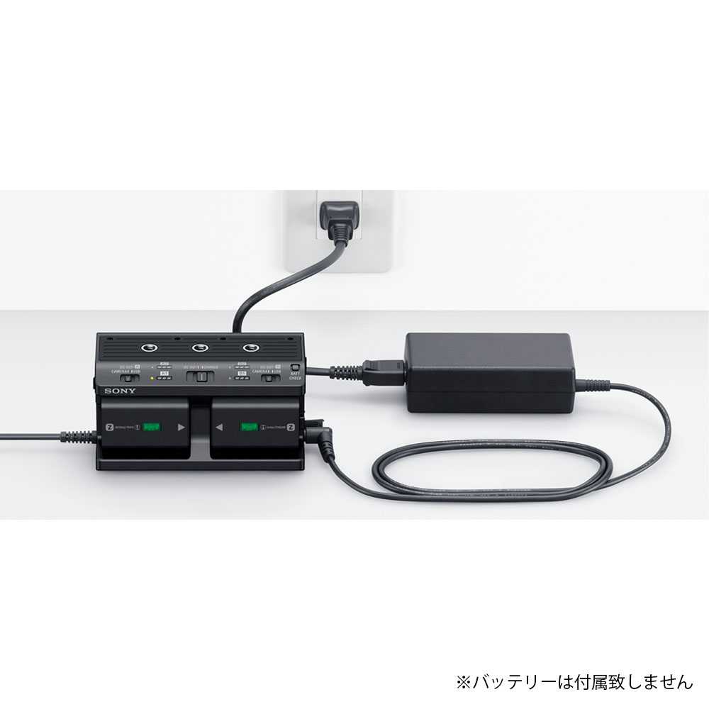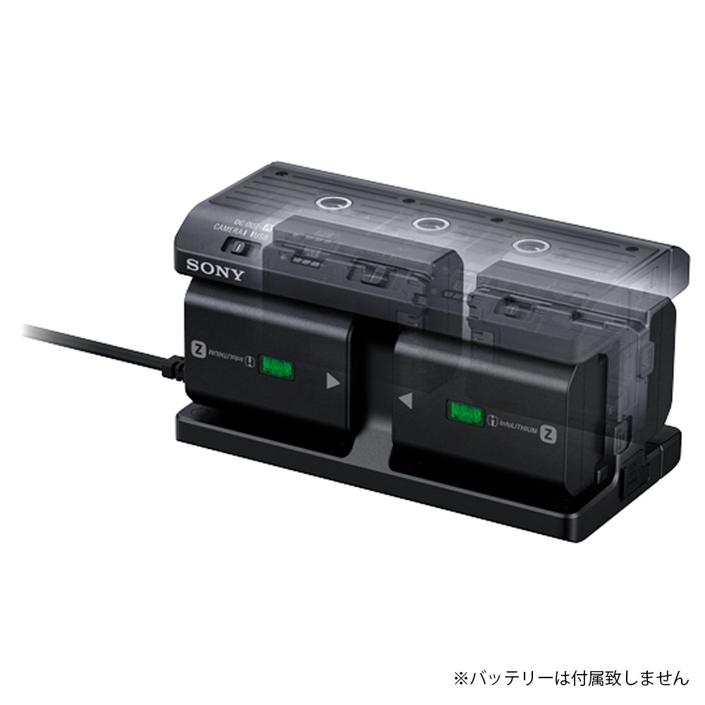 付属のACアダプターを使用して、Zシリーズバッテリー「NP-FZ100」4個を約480分で急速充電できます。バッテリーの充電中はCHARGEランプが点灯し、充電状況を確認できます。また、BATT CHECKボタンを押すと、残量確認ランプにバッテリー残量が3段階で表示され、4個のバッテリー残量を一度に確認できます。