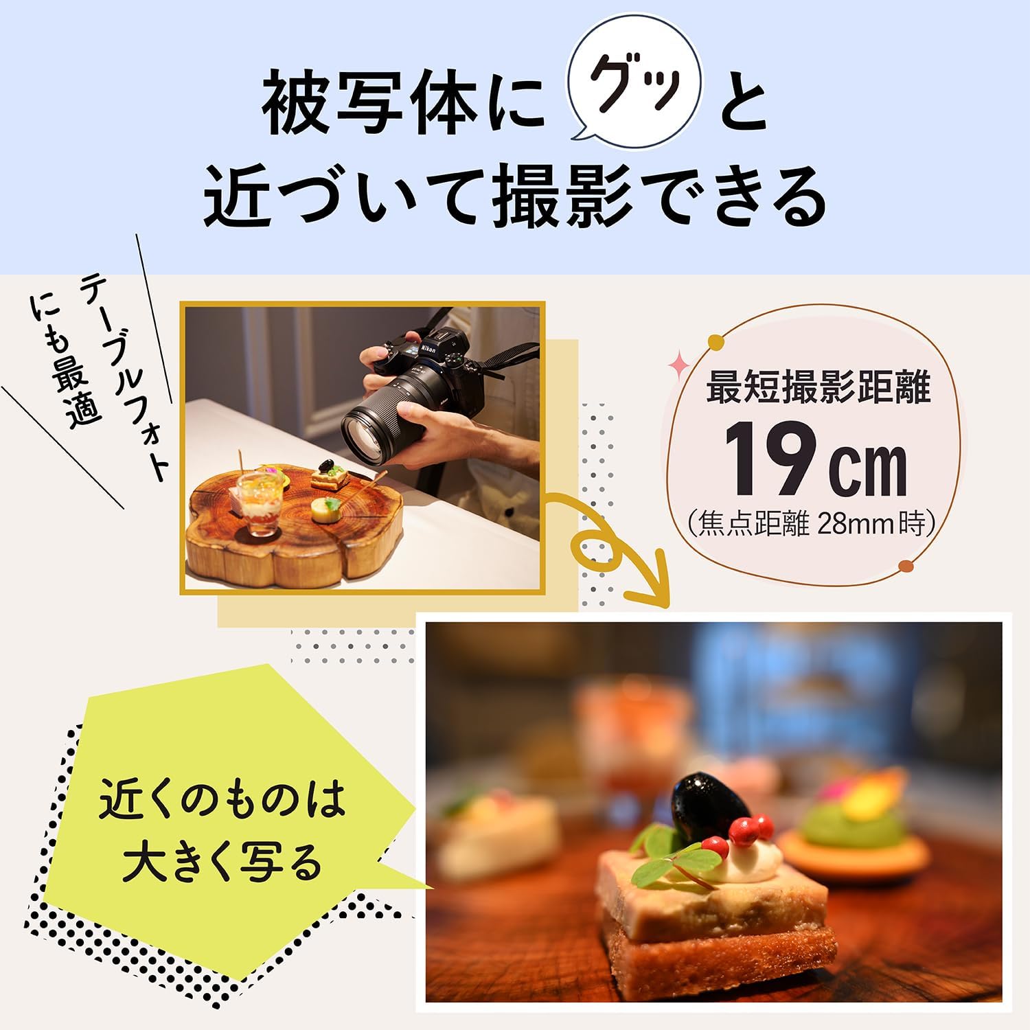 被写体にグッと近づいて撮影できる、最短撮影距離0.19mを実現。被写体をダイナミックに撮影したいときや、被写体から離れられないテーブルフォト撮影時などに便利です。