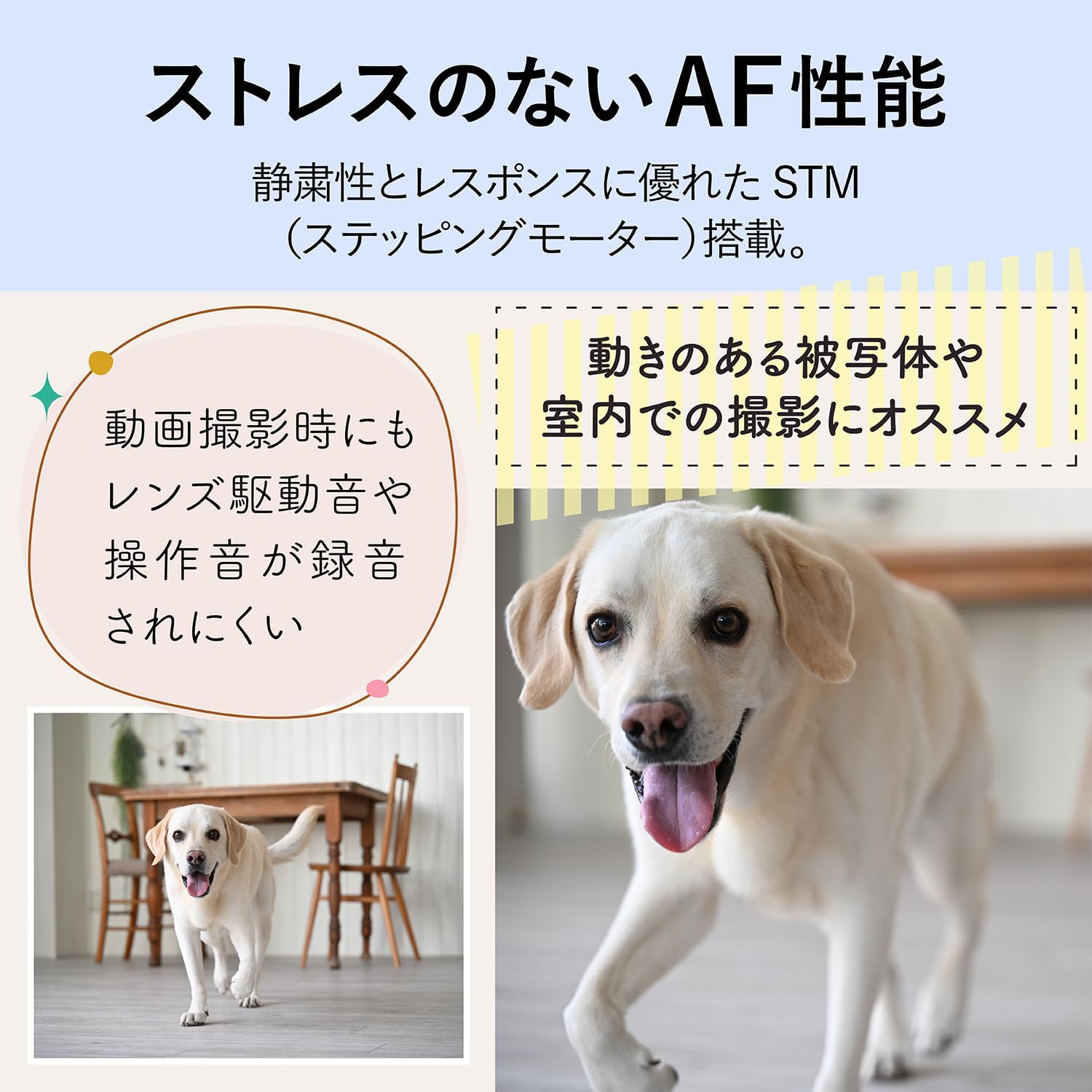 レスポンスに優れたSTM(ステッピングモーター)の採用により、静止画、動画を問わず、動いている被写体にも素早くピントを合わせることが可能です。STMは静粛性にも優れており、ピント合わせや動画撮影時のレンズ駆動音、動作音を大幅に低減。舞台などでも、静かに撮影が行えます。