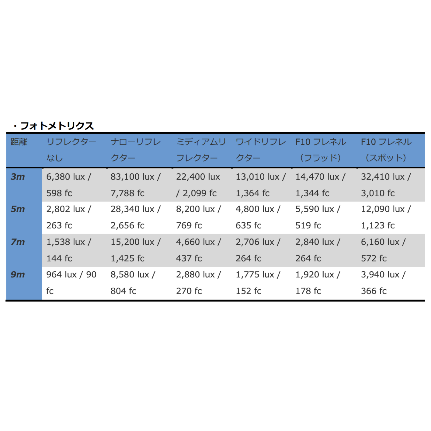 3mの距離で、最も狭い15°のナローリフレクターを使用すると83,100ルクス、中間30°のミディアムリフレクターで22,400ルクス、55°のワイドリフレクターで9,610ルクスの出力が得られます。