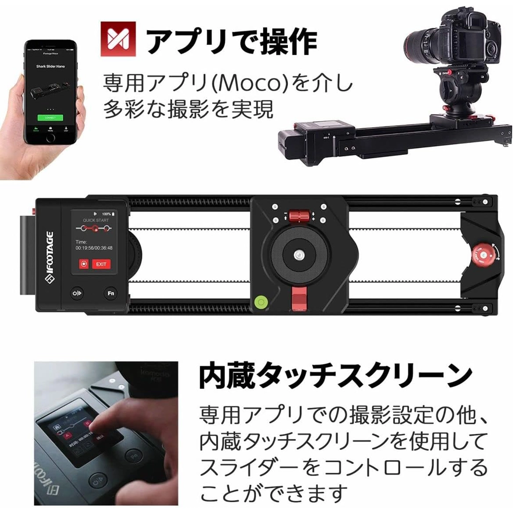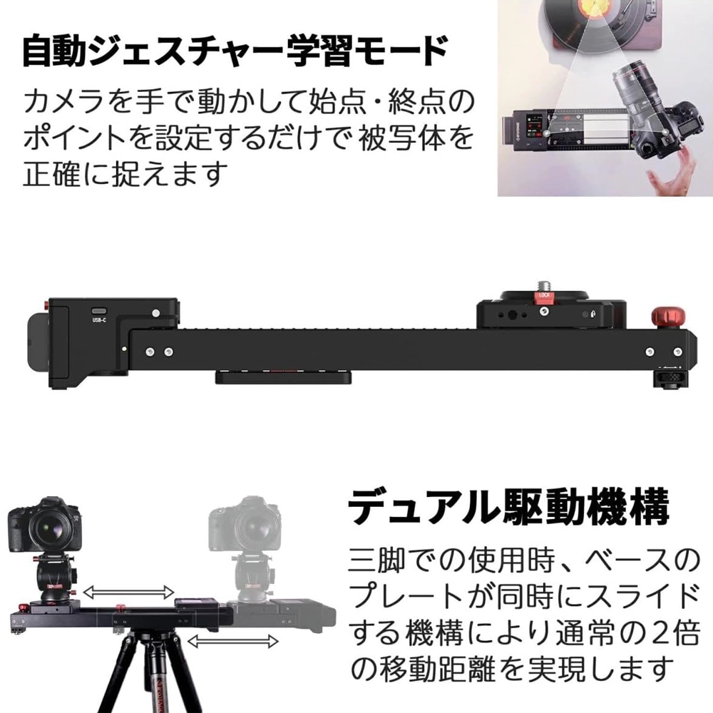 独自の2in1デュアル軸モーションコントロール設計により、スライドの動きと360度のパンの動きを組み合わせた高度な動画撮影が可能です。スクリーンでの操作により、ストップモーション、タイムラプス、パノラマ撮影などの高度な動画撮影を実現します。
