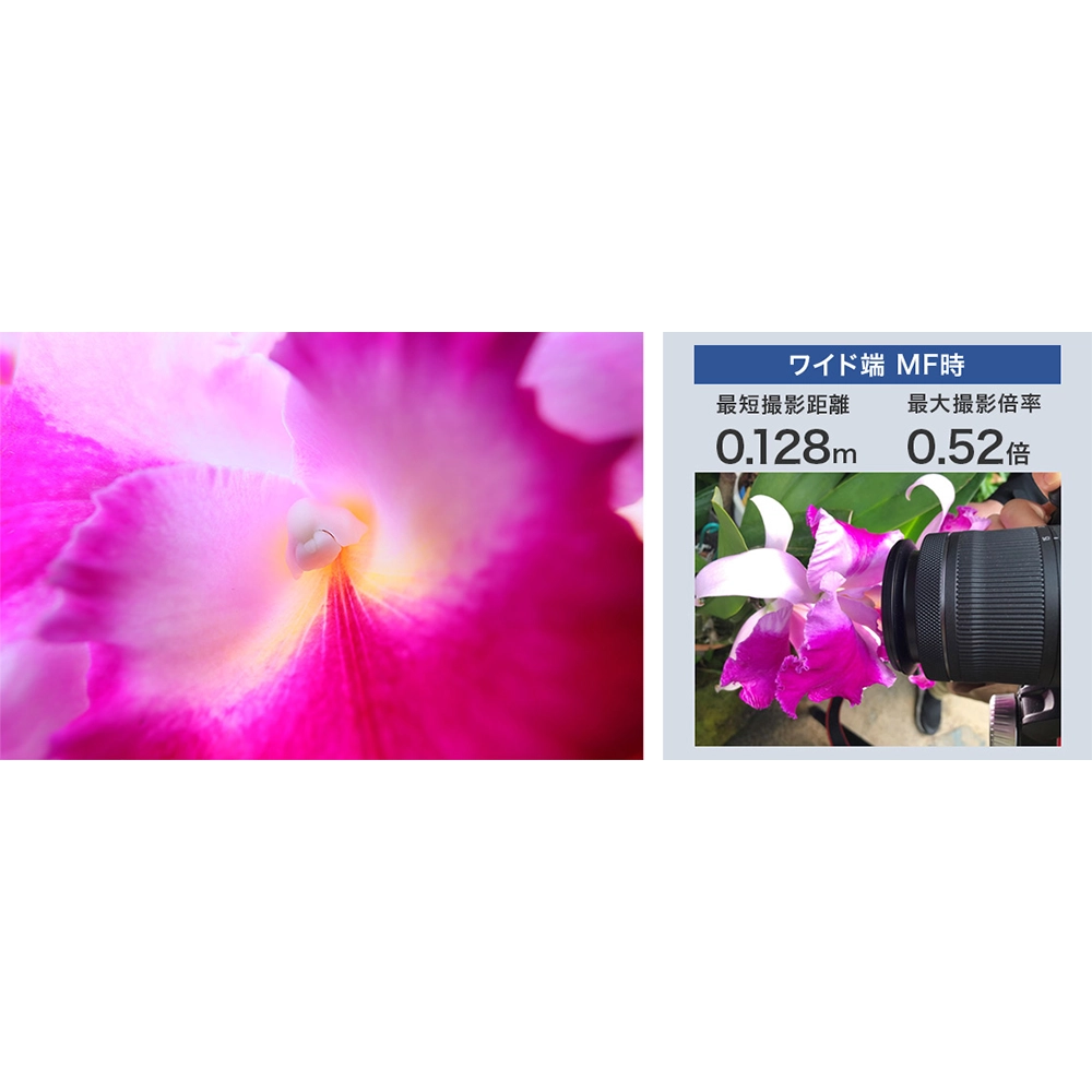 マニュアルフォーカス時は、ワイド端15mm時、0.128mまで被写体に近づいて撮影可能。 最大0.52倍の撮影倍率で、被写体をクローズアップできます。