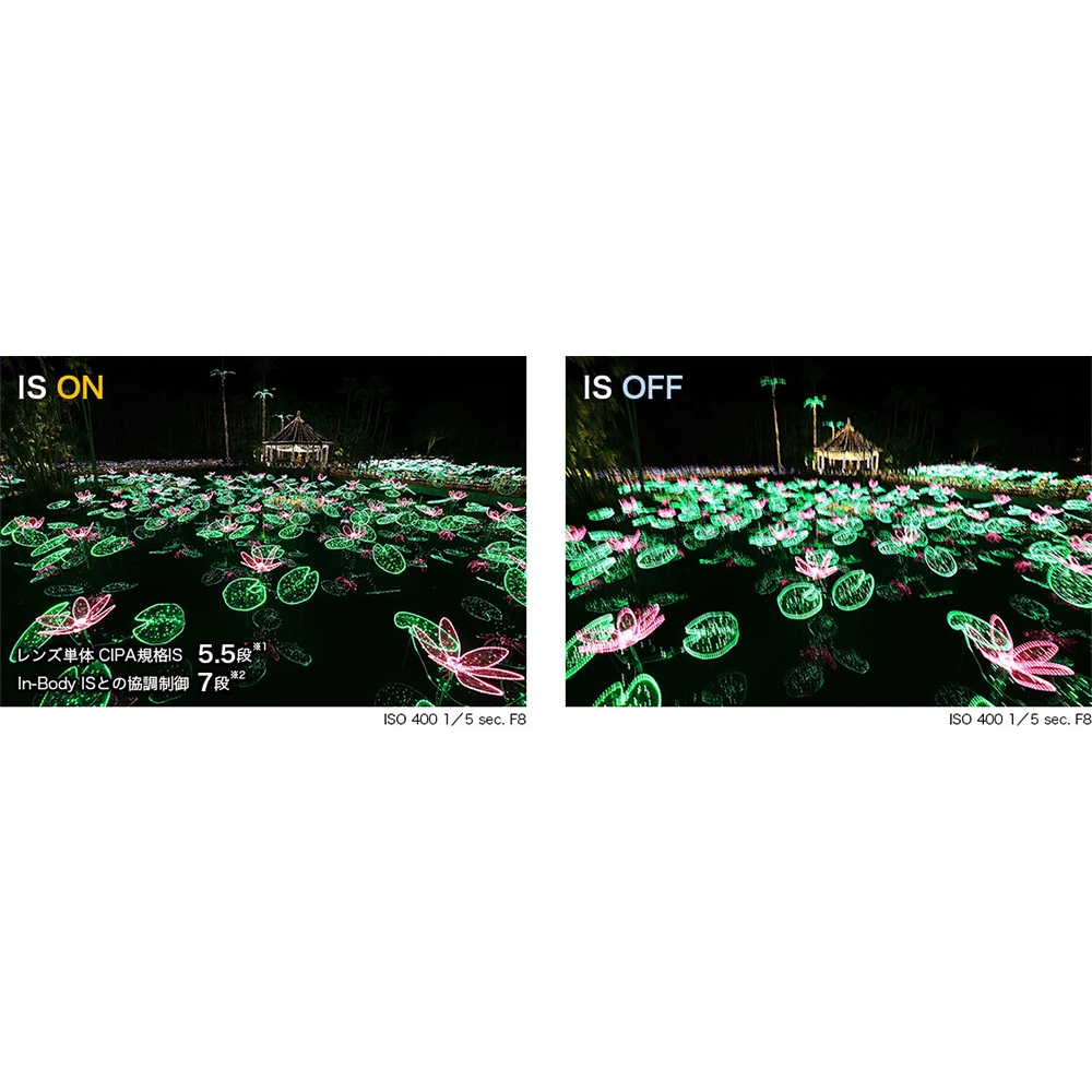 光学式手ブレ補正の効果は5.5段。さらに、ボディ内手ブレ補正機構を搭載したEOS Rシリーズのカメラに装着時は、協調制御により7.0段の手ブレ補正効果を発揮します。