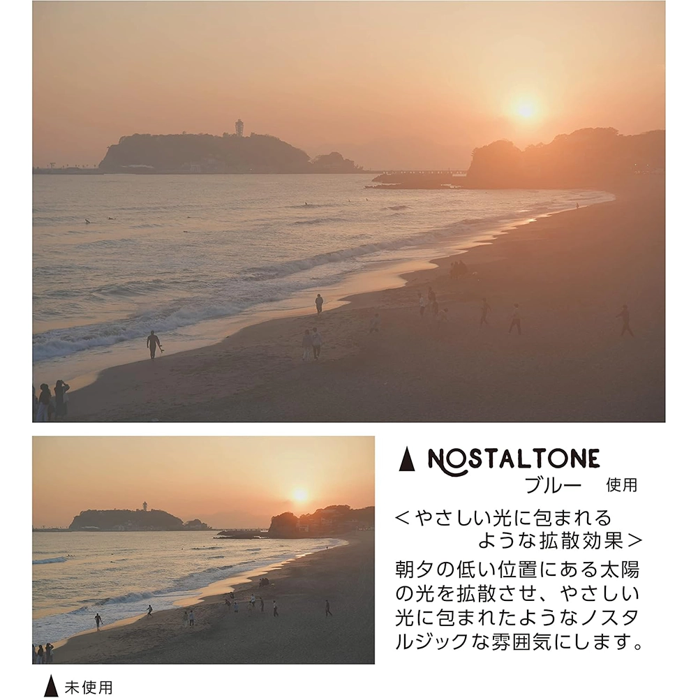 ノスタルトーン・ブルーには光を拡散させる効果もあります。朝夕の低い位置にある太陽の光を拡散させ、やさしい光に包まれたようなノスタルジックな雰囲気にします。真逆光では拡散効果が強いため、半逆光やサイド光で取り入れたり、太陽全体または一部を建物や木、人などで隠してして撮るとほどよい拡散効果になります。日没後の撮影では街灯や信号機、車、自動販売機などの光をふんわりと拡散させてシーンを印象づけます。