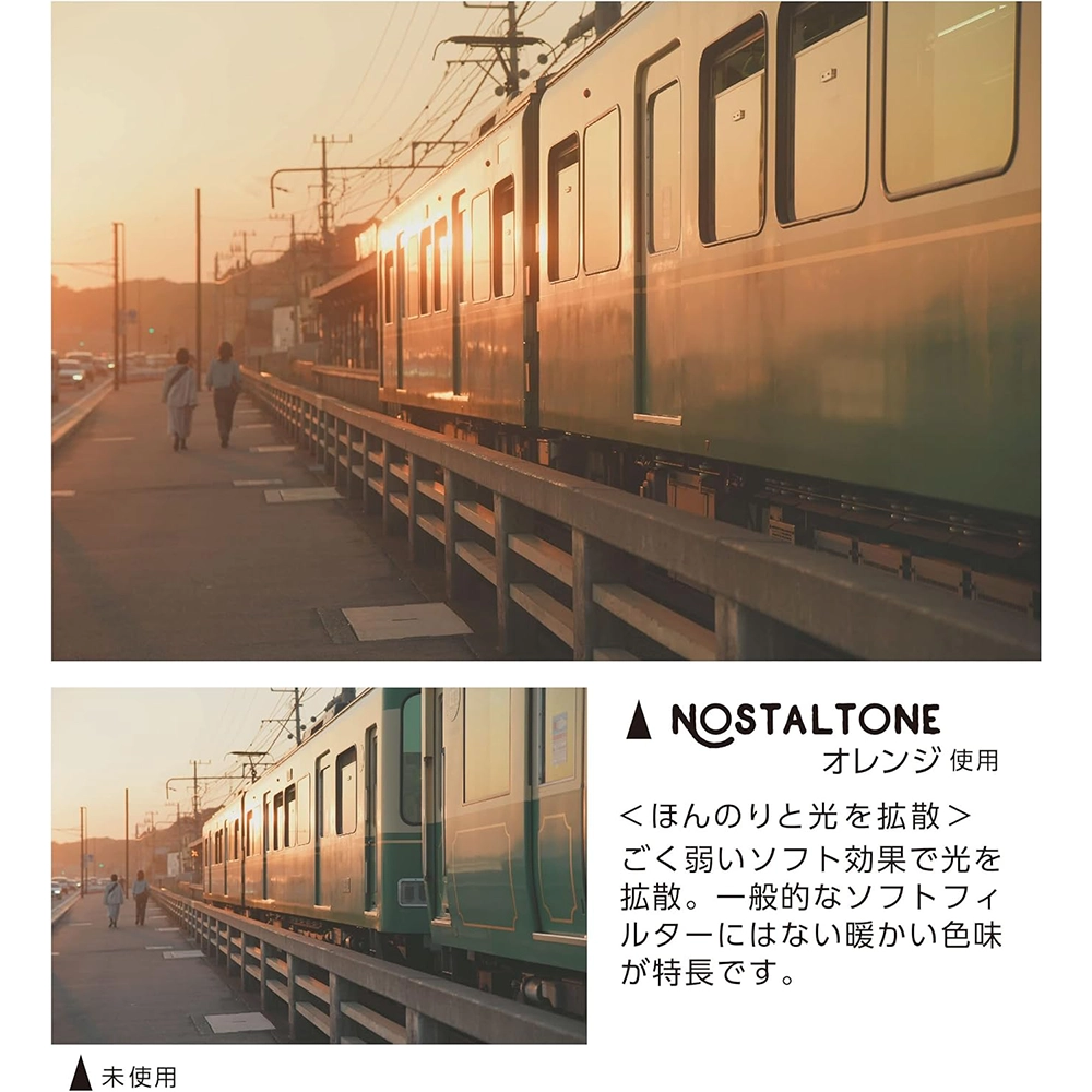 ノスタルトーンはノスタルジックな雰囲気を出すために、ガラス表面に反射を起こしやすいコーティングを施しています。それにより太陽の光を画面の中央に入れた時に、光のリングを発生させることがあり、アニメのワンシーンのようにドラマティックに演出します。ブルーとオレンジでリングの色の出方が異なります。使用するレンズ、光源の位置や入射角度、焦点距離、絞りによってリングの色や本数に変化があります。ノスタルトーン・オレンジはブルー系のゴーストが出やすく、写真のアクセントになります。