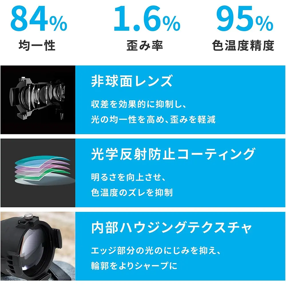 19°レンズ付きのFMマウント用プロジェクションアタッチメントです。本製品を装着することで美しい円形のスポットライトが表現可能です。また、4辺にはシャッターブレードが備わっており、光を切ることができます。