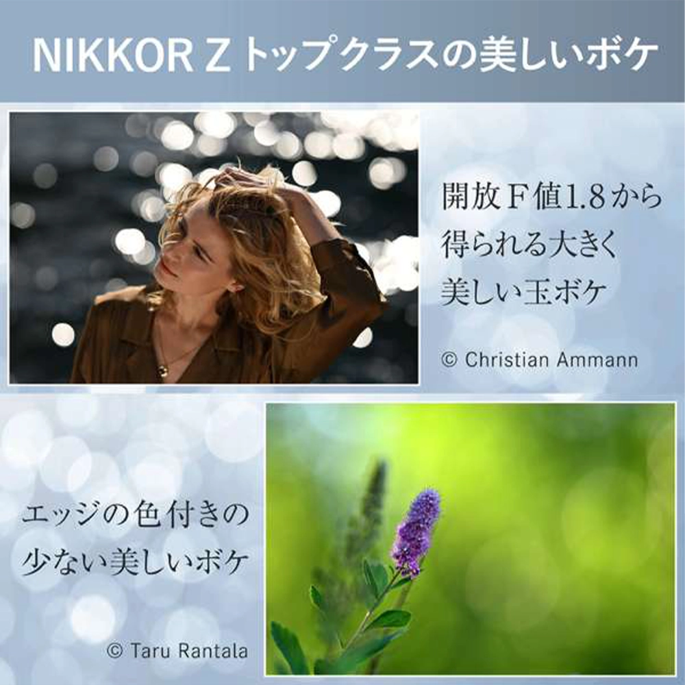 レンズ構成の最適化を図ることで口径食を極限まで低減し、開放F値1.8から円形度の高いボケ形状を実現。通常のレンズでは難しい、絞り開放から画面全域で円形度が高く美しいボケを活かした表現ができます。SRレンズとEDレンズを採用することで、ボケのエッジ部分の色付きを抑制し、大きく柔らかなボケ味を実現。ピント面から遠ざかるにつれて滑らかに大きくなる柔らかいボケとそのグラデーションで、人物などの被写体の立体感を際立たせます。