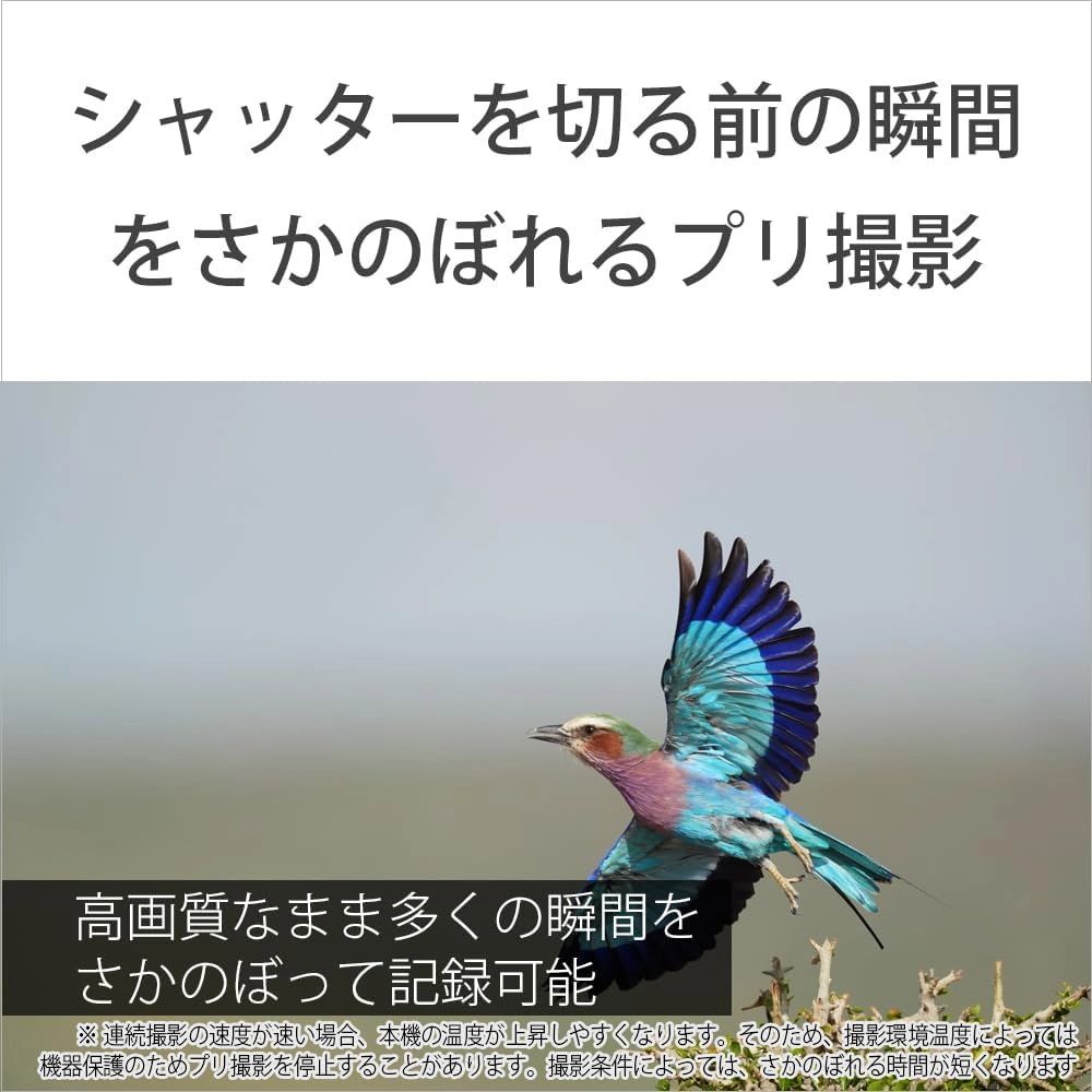 シャッターボタンを半押ししながら被写体を捉えた後に全押しすると、半押ししていた最大1秒前までの連写画像を記録することができるプリ撮影機能を搭載しています。飛び立つ瞬間に全押しが間に合わなくても、シャッターボタンを押す前にさかのぼって撮影されています。また、すべてのファイル形式/画像サイズでクロップされることなく、AF/AE追随最高約120コマ/秒の連続撮影ができるので、高画質なまま多くの瞬間をさかのぼって記録できます。