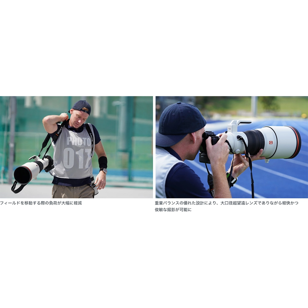 ソニーが持つ最先端技術を余すことなく投入し、圧倒的なスピード性能、G Masterならではの優れた解像性能と自然で美しいぼけ描写、プロの撮影を支える高い操作性と信頼性のすべてを圧倒的な軽量化を実現したボディに凝縮した大口径超望遠レンズです。Eマウント初の超望遠単焦点レンズをラインアップに加え、躍動的かつ決定的な瞬間を高画質に収めることが求められるスポーツや報道、野生動物などの撮影領域でプロフェッショナルのニーズに応えます。