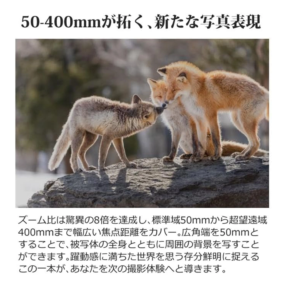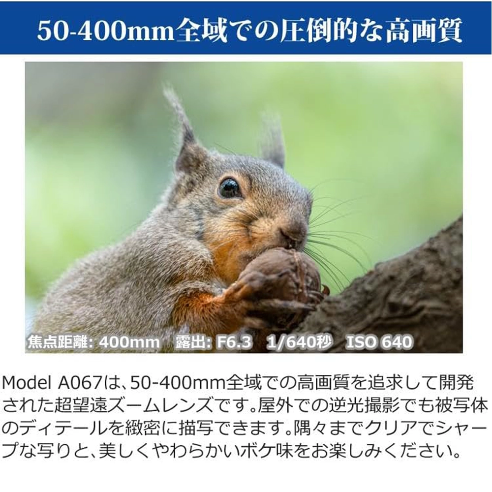 50mmから400mmまでカバー、フルサイズミラーレス一眼カメラ用超望遠ズームレンズ