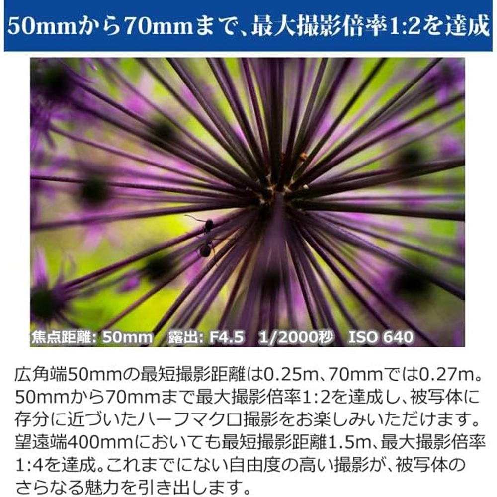 - 50mmから70mmまで、最大撮影倍率1:2を達成