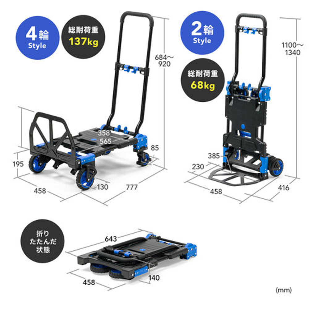4輪走行時は台車として使用でき、2輪走行時はキャリーカートとして使用可能な2WAYの台車です。
