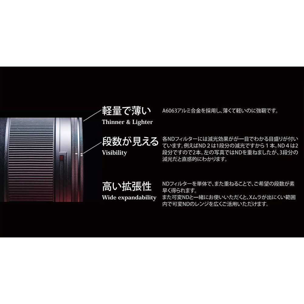 マグネットスリムは、磁石の力によって着脱できるような仕組みになっています。マグネットスリムレンズアダプターをベースに、ND 2,4,8,16と、ムービー撮影に適した濃度のセットです。 ダイナミックレンジブースト機能を撮影途中で使うと、ベース感度が3段分上がります。 でも、ND8を装着するだけで3段分の減光ができますので、他の設定を変えることなく、 そのまま撮影を続行することができます。