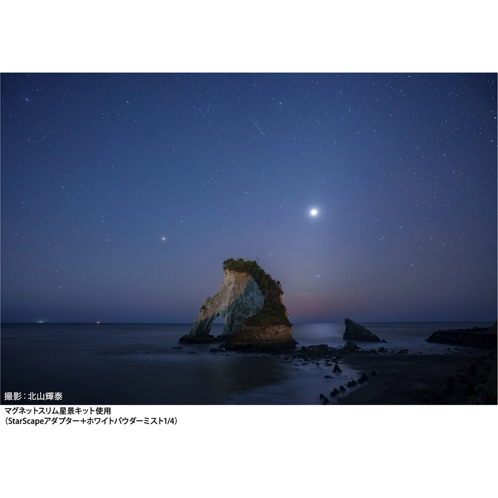 StarScape(スタースケープ)アダプターは、夜空がオレンジ色や黄色に色カブリを起こしてしまう現象を抑制し、クールな夜空を演出します。本品には、マグネットでホワイトパウダーミストを脱着交換するためのマグネットベースを内蔵し、レンズにねじ込んで装着します。単独でもお使い頂けます。