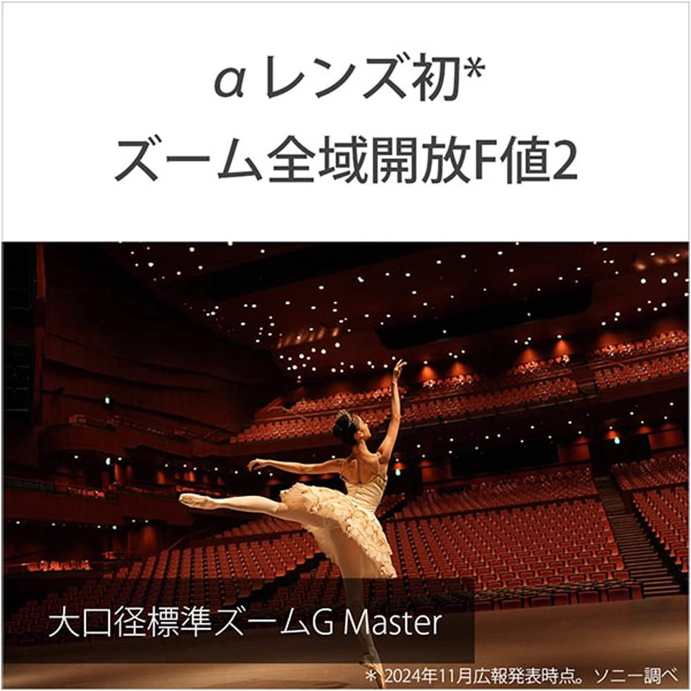 開放F値2通し大口径標準ズームG Master。ポートレートをはじめ、さまざまな被写体の撮影に適しています。広角28mmから中望遠70mmまでのズーム全域で開放F値2、単焦点レンズに迫る解像性能とコントラスト、加えて圧倒的なAF性能を実現しながらも、驚くほどコンパクトな小型・軽量設計となっています。ソニーの最新レンズ設計技術を凝縮させて実現したこの1本が、クリエイターのさらなる表現の地平を切り拓きます。
