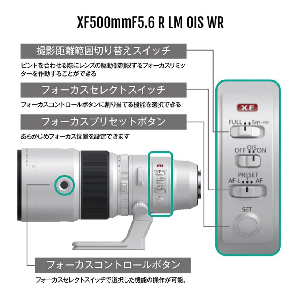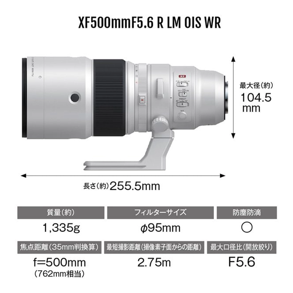 超望遠500mm(35mm判換算:762mm相当)の領域をF5.6の明るさで撮影可能で、「XFレンズ」最高峰の光学性能を備えた超望遠単焦点レンズが登場。35mm換算で1.5倍相当に拡大された画像が得られるAPS-Cフォーマットの利点を生かし、超望遠レンズながら質量を約1,335gに抑え、小型軽量化を実現。