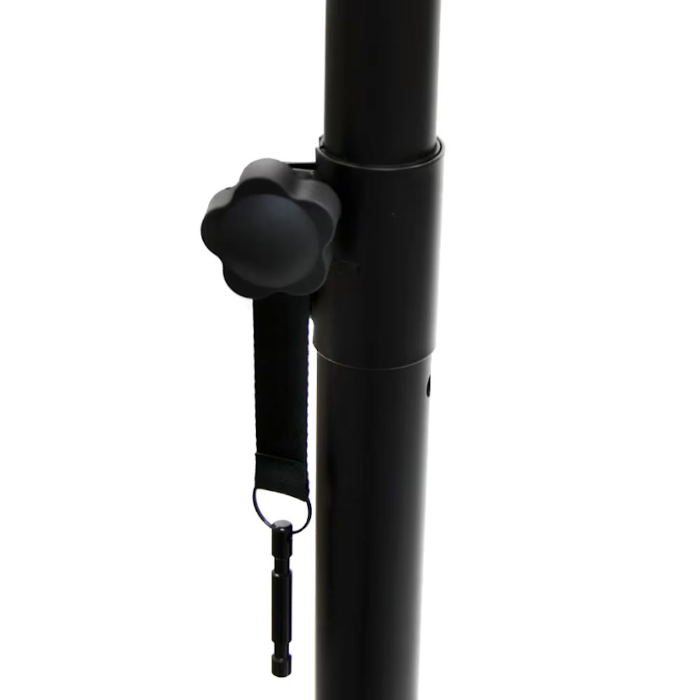 ポールの先端径は35mm、反対側38mmになっているので、アダプターを使わずポールの向きを変えるだけで先端径を変更でき、多くのスピーカーにマウントできるよう工夫されています。三脚もノブを緩めるだけでスムーズに開き、脚の開き具合は任意に設定できます。